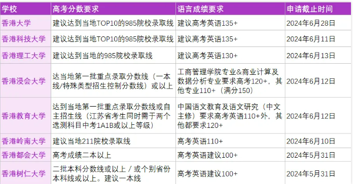 可以看到香港大部分院校的本科申请已经截止了。但是也有好消息,原本6月9日及截止的香港恒生大学的本科申请,将于6月17日至26日再度开放,接受高考同学申请。录取将于6月底高考成绩公布后陆续发放,于7月初结束。建议申请恒生大学的同学高考分数在二本线以上,英语成绩在100+。抓紧时间咯!