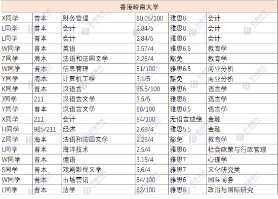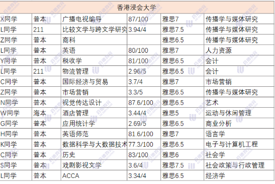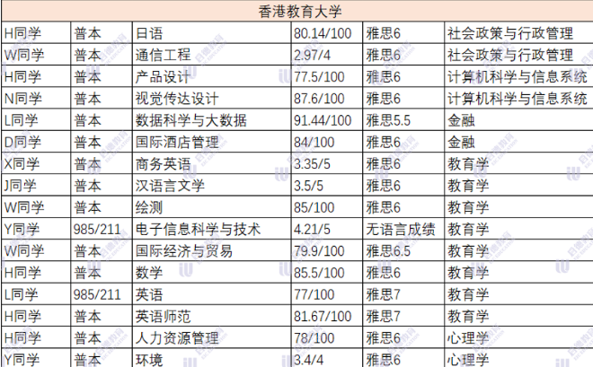 香港浸会大学香港教育大学和香港岭南大学这三所院校院校背景为普本的同学较多,大多数同学的雅思成绩在6.5以上,超过一半的同学均分在80以上。浸会岭南部分专业接受英语六级申请,具体看专业要求;不排斥双非本科学生。所有院校有与申请方向相关的实习、科研、比赛经历会优先考虑