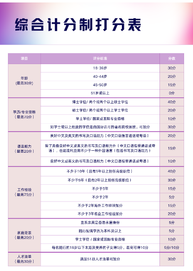 适合各行业人才,申请人根据申请人的年龄(最高30分)、学历(最高70分)、工作经验(最高75分)、人才清单(最高30分)、语言能力(最高20分)、家庭背景(最高20分)6个项目计算分数来进行评分,满分245分。申请人达到综合分数80分即可递交,相对而言,综合计分制更适合大多数普通人。比较容易获批的人才类型是高学历、有丰富工作经验、名校名企背景、金融或科技等港服紧缺行业人才。