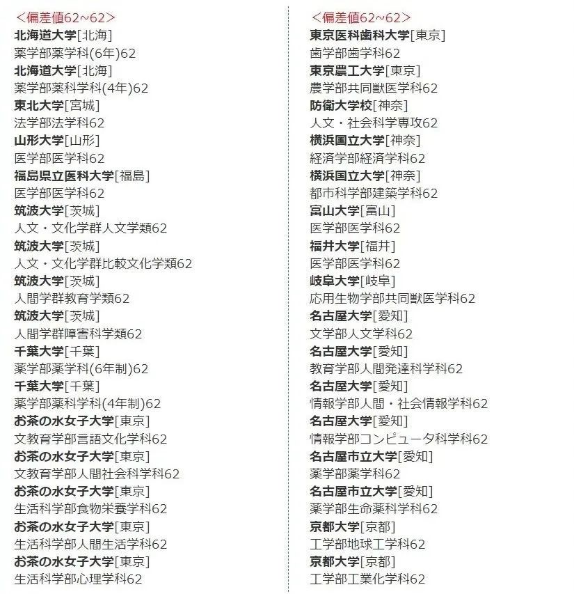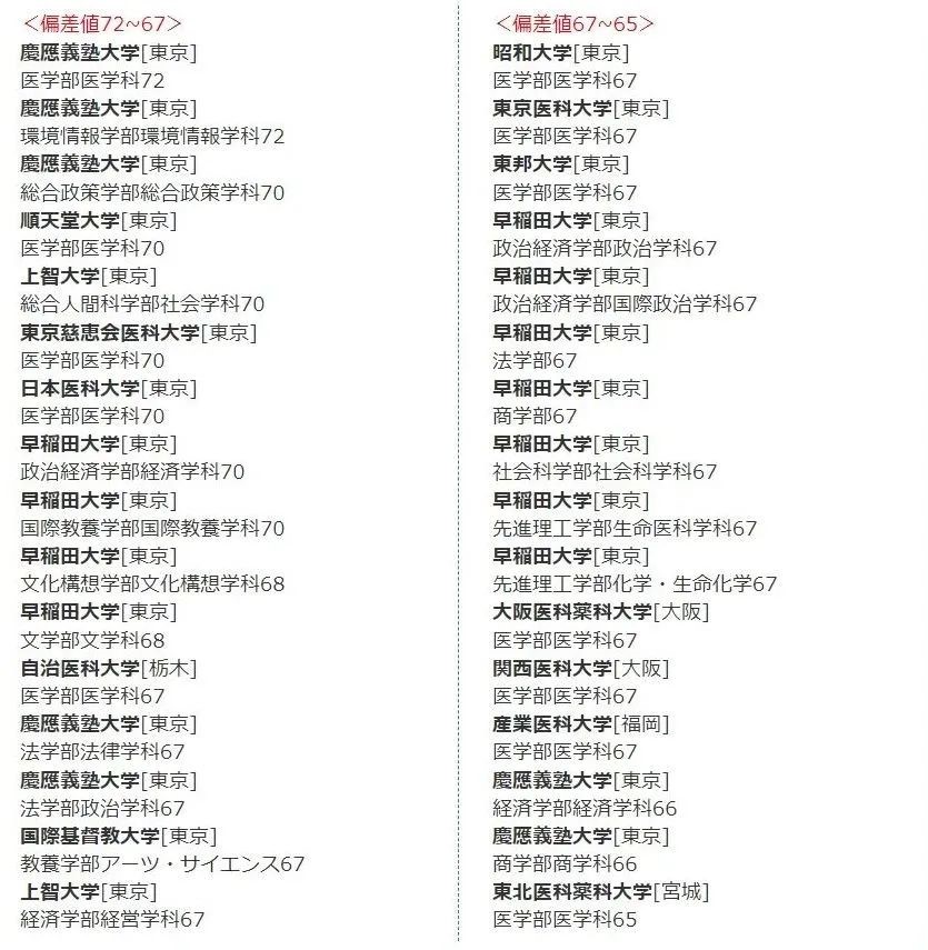 在日本,每年各所大学的各个专业都有偏差值的排名,根据学校的不同、文理科的不同以及具体专业的不同,偏差值也会有所不同,所以大家要根据实际情况进行参考。