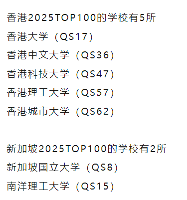 香港主要的八所院校在QS世界大学排名中,除香港教育大学外其它七所大学都榜上有名,而香港教育大学的教育专业在全球范围内也是领先的。新加坡的院校在名次上稍胜一筹,而中国香港的院校在数量上则稳占上风。