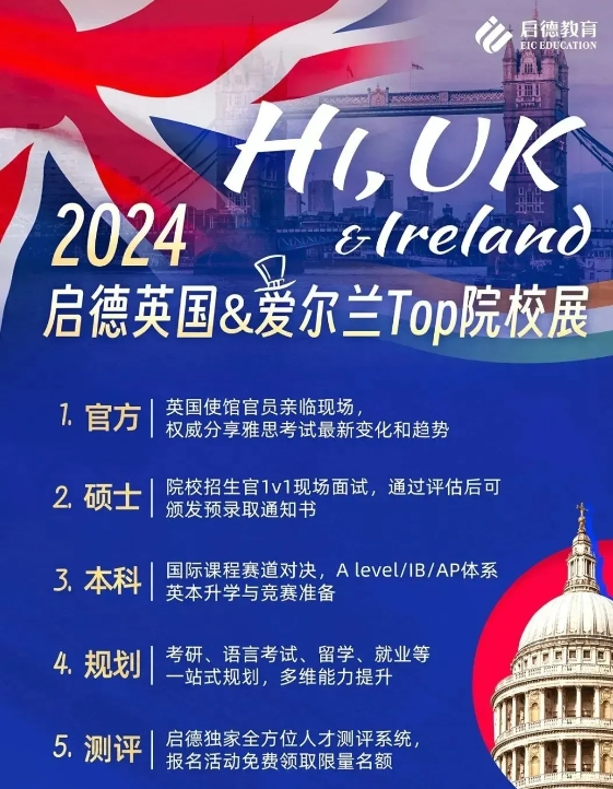 Hi,UK启德英爱TOP院校展启德英爱TOP院校展已连续举办7年,每年都会邀请数十所英国和爱尔兰名校现场面试,讲解最新录取要求,分享最新申请趋势。同时邀请启德英国留学专家、就业能力提升导师、科研能力提升导师进行申请指导、升学备考、实习就业、科研规划等全方面的指导。有心仪院校的学子可以提前预约,现场拥有和心仪大学招生官专属的模拟面试时间,以便了解申请趋势,评估自身申请竞争力,提前为申请心仪大学做好充足准备,还有机会获得预录取!也欢迎对英国留学有疑问的学生和家长来参加展会,跟实习、求职大咖面对面沟通,进行留学+就业同步规划。
