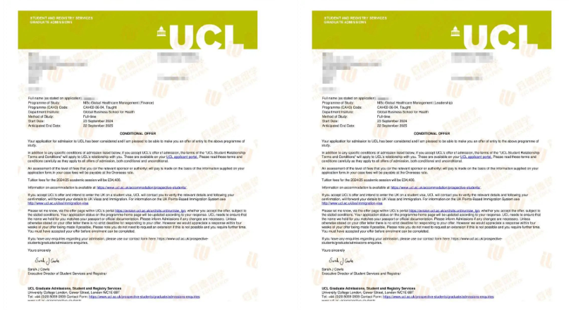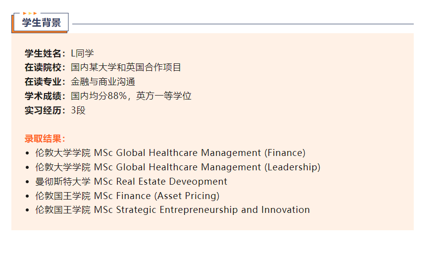 学生就读于国内某大学和英国某大学的HND,专业是金融与商业沟通,22年本科毕业。学生在本科期间成绩非常稳定,国内达到了88%,英方成绩拿到了一等学位。学生一开始来我这里咨询过,后来选择了另一家机构,但没有拿到满意的录取结果,这次重新找到我帮忙规划申请。考虑到之前遇到的坎儿,学生和家长在选择机构和规划师时更加谨慎,也付出了更多精力关心规划流程。由于学生是HND项目,本身对英国有所了解,也非常认可英国的教育质量和学术水平,因此想要留学英国,但对未来的发展方向比较迷茫,会比较在意是否能进入名校。有了名校背景可能未来转专业或者直接就业都会更有优势。学生前一次的申请没能精准定校和充分挖掘优势,申请了布大、格拉等院校但没有获得理想的录取结果。这段失败的申请经历,让学生对进入名校信心不足,我帮他重新梳理了个人条件,学生本身成绩很好,有英国学习经历,也积累了三段有效实习。我认为他还是有冲刺G5和TOP50的可能性。为了让学生坚定信心,我罗列了英国G5院校的申请要求,提供了启德往年的大数据,分析各个专业的录取难易程度,重新选择了更适合他的专业。我们结合学生的个人特点修改了一版更有针对性的文书,结合院校录取要求强调了学生个人优势,以及对目标专业的个人看法。值得一提的是,很多英国大学都有“先到先得”的录取惯例,我们在院校开放申请后的第一时间就递交了申请,学生很顺利在第一批下Offer的时候就拿到了UCL的录取,后续又拿到了曼大和伦敦国王学院的录取,整体还是非常顺利的。