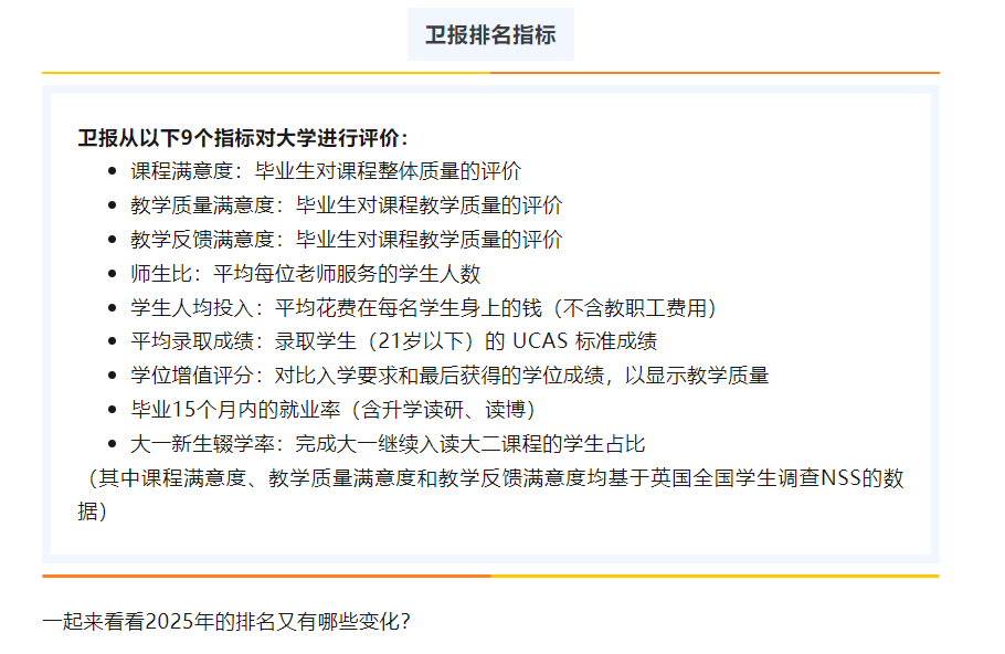 9月7日上周六,英国卫报发布了2025年英国大学排名。这份排名一直以来都是英国本土极具影响力的参考之一,是因为它非常注重学生的体验。这些指标全面地反映了学生在大学期间的学习、生活和未来发展情况,对于即将选择英国大学的同学们来说具有重要的参考价值,可谓“真正给学生看的排名”。