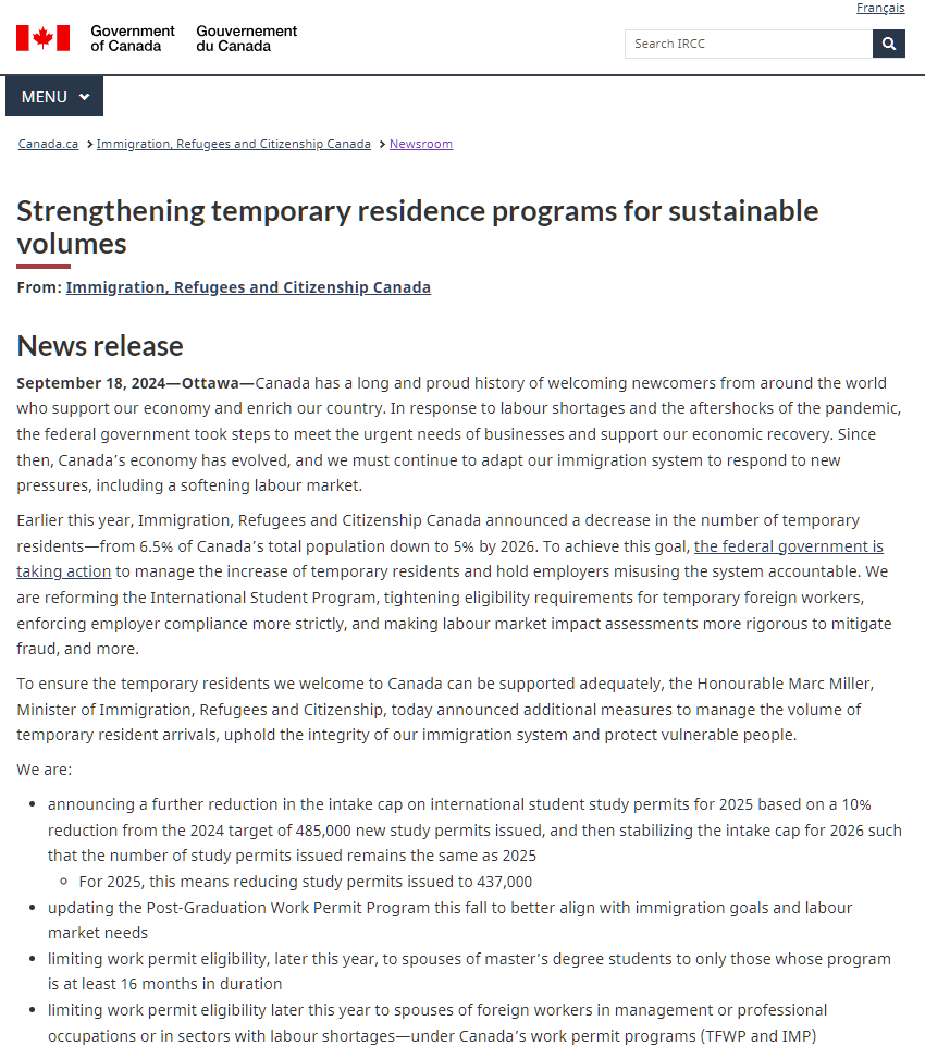 IRCC官网发布,为了达到移民部在相关领域的预期,目前确认的已经实施&待实施改革具体措施如下:》拟议将临时居民比例从加拿大总人口的 6.5% 减少到 5%,这将反映在 2025-2027 年移民水平计划中,该计划将于 2024 年 11 月 1 日发布。》如果公立学院的毕业生毕业于与长期短缺职业相关的专业,他们仍有资格获得最长三年的毕业后工作许可(PGWP)。》作为 PGWP 计划变更的一部分,所有申请人都必须证明其具备最低限度的法语或英语语言能力。自 2024 年 11 月 1 日起,任何申请毕业后工作许可的人都必须达到加拿大语言基准 (CLB) 7 级(大学毕业生)和 CLB 5 级(学院毕业生)。》2025-2026 年学习许可的名额上限将包括硕士和博士生,他们将必须提交省或地区的证明信(PAL)。留给硕博学生的配额占比约为12%。》2024 年 1 月 1 日,学习许可申请人的生活费要求进行了更新,以更好地反映加拿大的真实生活成本,并有助于防止学生的脆弱性和剥削。》2024 年预算提议从 2024-2025 年开始的五年内投入 7.435 亿美元,并持续投入 1.595 亿美元来支持加拿大庇护系统的稳定性和完整性。相关措施的更多详细信息,会陆续在IRCC官网上进行发布更新。