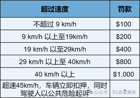 澳洲的超速罚款是根据超过速度来计算的,对应罚款金额如下: