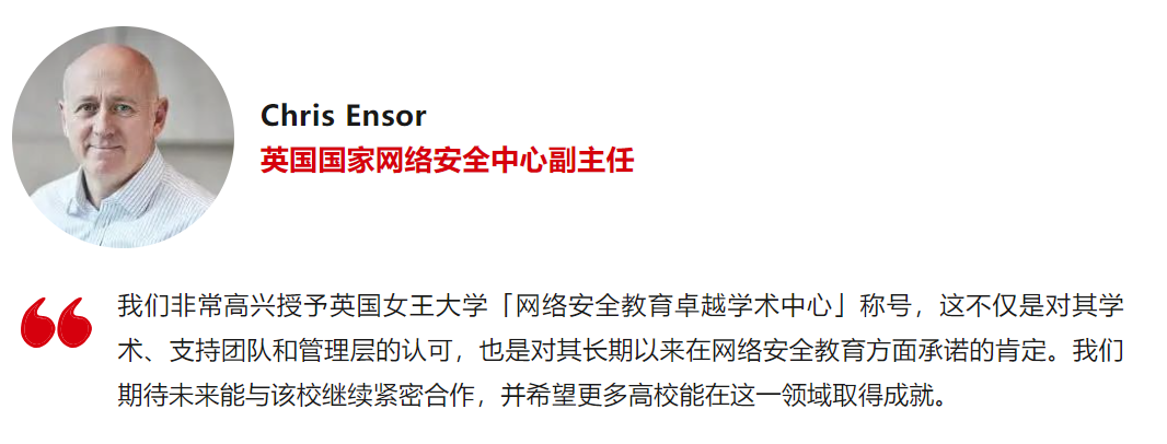 这个 ACE-CSE 奖项,是在此前英国女王大学获批英国国家网络安全中心认证的应用网络安全硕士学位项目的基础上又一重大成就。为此,英国女王大学接受了严格的考核评估,并充分展示了其在培养网络安全教育人才方面的卓越表现,以及与行业、政府和教育界的深度合作。