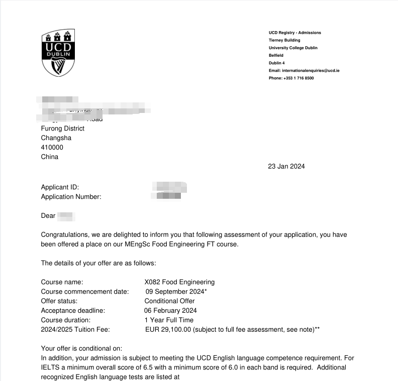 顾问点评:爱尔兰的食品相关专业是国家强势专业。爱尔兰的食品领域在全球范围内领先,是全球首个将食品安全列入可持续发展计划的国家。爱尔兰是欧洲最大的乳制品和牛肉出口国之一,食品科学与技术专业的毕业生在国内外都有很好的就业机会。学生的申请目标是非常明确的,且是一边工作一边申请的,拿到录取后两个月才脱产准备下雅思,好在最后破釜沉舟首考就考到了雅思6.5 单科不低于6.0的分数,也是让人非常惊喜.