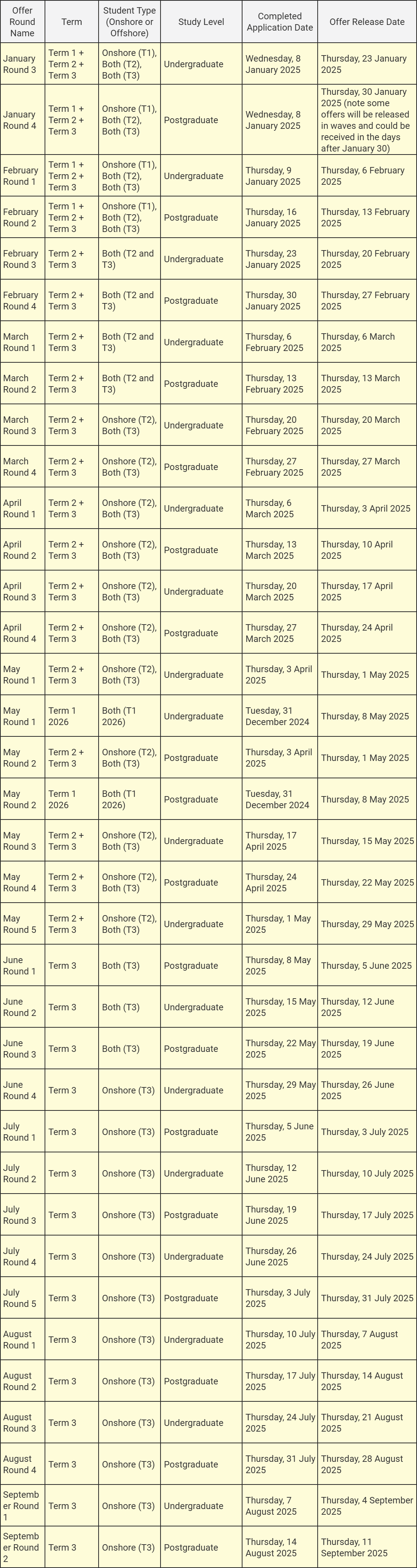 1.UNSW Syndey 2025年将继续采取特定日期发放offer的政策,发放顺序按学历层次交替进行,即一周发放UG Offer,下一周发放PG Offer,依此类推,具体发放日期如下表
