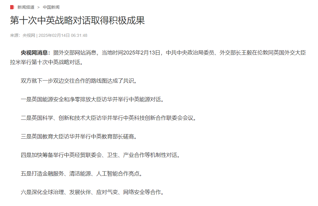 据央视网报道,当地时间 2 月 13 日,中共中央政治局委员、外交部长王毅在伦敦同英国外交大臣拉米举行第十次中英战略对话,成果积极。此次对话落实两国领导人共识,为中英合作深化做了规划,双方就双边交往合作路线图达成共识,推动多领域合作全面开花。