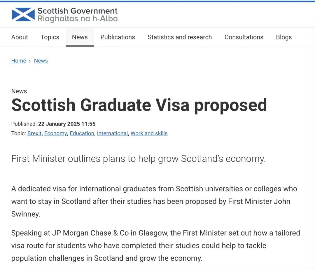今年1月下旬,英国苏格兰政府网发布一则新闻:为缓解劳动力短缺,苏格兰计划推出新的毕业生就业签证(Scottish Graduate Visa)。预计2025年4月公布新签证政策的草案。新签证将与苏格兰税号绑定,确保持有者在当地生活工作。
