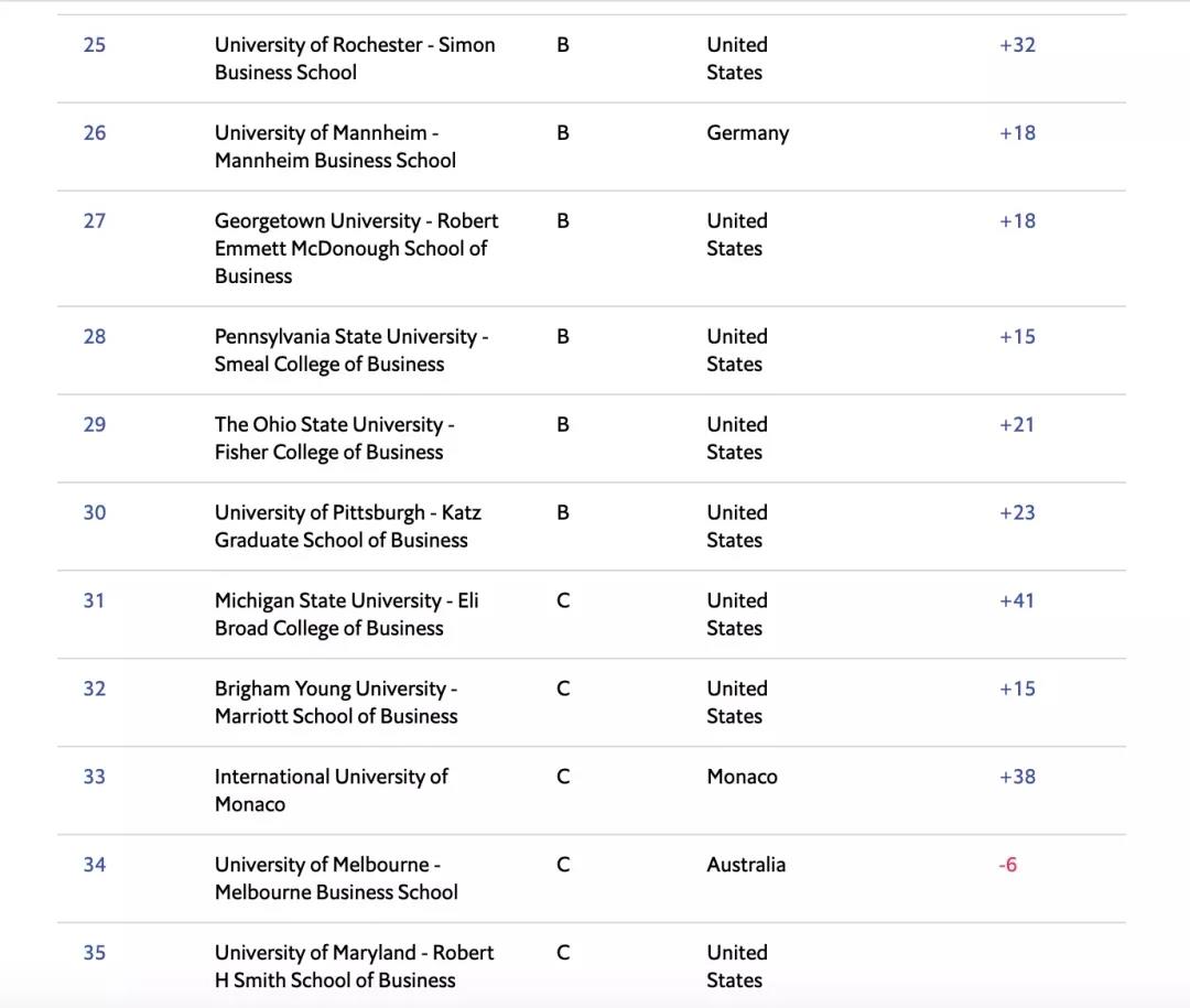 虽然众多顶尖美国商学院都放弃参与评比,但美国依旧是这次评比的最大赢家,一共有35所美国商学院上榜此次的榜单,且上榜的商学院全部在D级及以上;