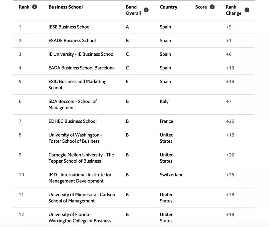 一共有5所西班牙商学院出现在MBA榜单,其中IESE商学院更是位列全球第一,ESADE商学院排在第20位。