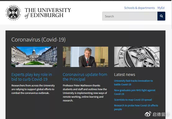 特殊时期,爱丁堡大学不仅在官网首页对新冠进行动态跟踪,校长和副校长致辞感谢学生和工作人员适应当前形势,并概述了该校如何实施远程工作、在线学习和研究的新方式。