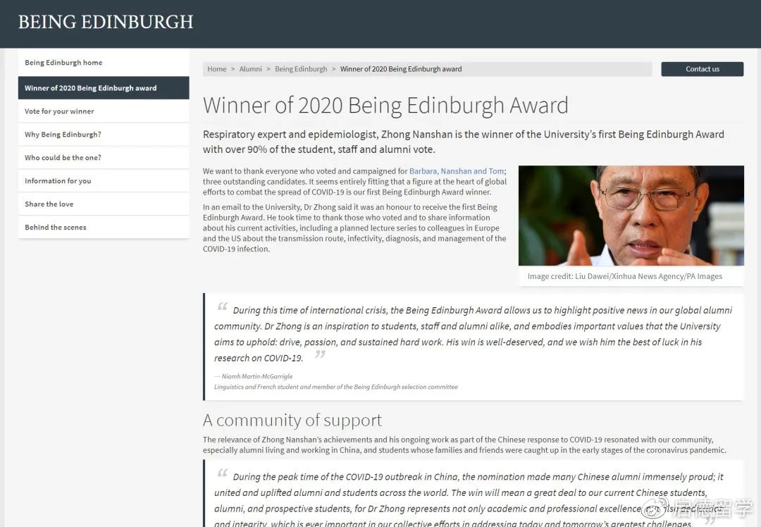 4月2日, 爱丁堡大学公布2020年度“Being Edinburgh(爱丁堡人物)”杰出校友奖评选结果,钟南山院士以超过90%爱丁堡大学校友及师生的票数当选,成为首届“Being Edinburgh Award”爱丁堡杰出校友奖的获得者!