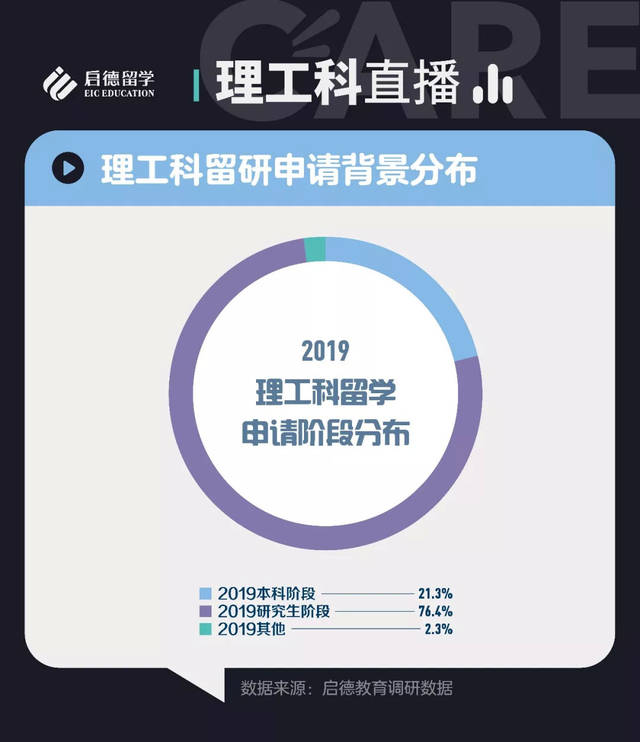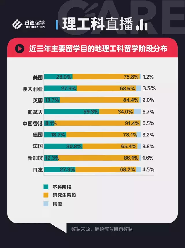 通过整理启德教育自有数据,小启发现理工科申请者更倾向于在研究生阶段留学,在2019年入读研究生阶段的占比达到76.4%,入读人数是同年入读本科阶段的3.6倍。这种趋势可能与留学花费及国内的就业环境有关:研究生留学较本科留学时长短,费用更合理,因而选择研究生留学的家庭有所增长。