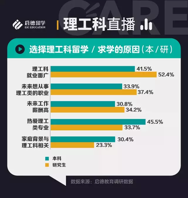 调研显示,理工科留学生选择攻读理工科专业的前五大原因依次为:“理工科就业面广”、“未来想从事理工类的职业”、“热爱理工类专业”、“未来工作薪酬高”、“家庭背景与理工科相关”。细看会发现,理工科留学五大原因中四项与就业相关,这也再次印证了选择理工科利于毕业后就业这一固有印象。
