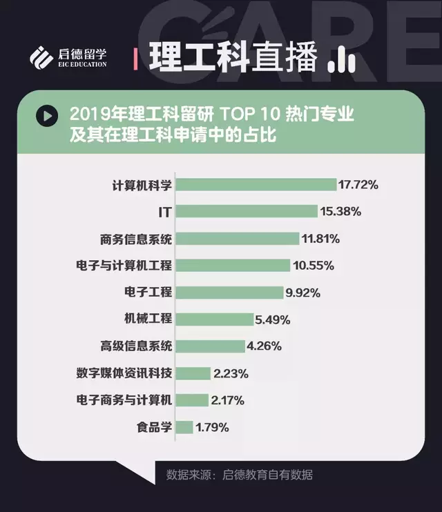理工科的热门专业录取每年都因申请情况、专业需求而产生差异性。根据启德自有数据显示,研究生申请中,最受申请者欢迎的十个理工科专业中计算机相关专业占最高。由于整体专业有细分趋势,老牌大类的热门专业占比下降,如工程、机械工程,专业细分化可以避免学生扎堆报考大类专业,从而降低有明确意向专业申请者的申请难度。
