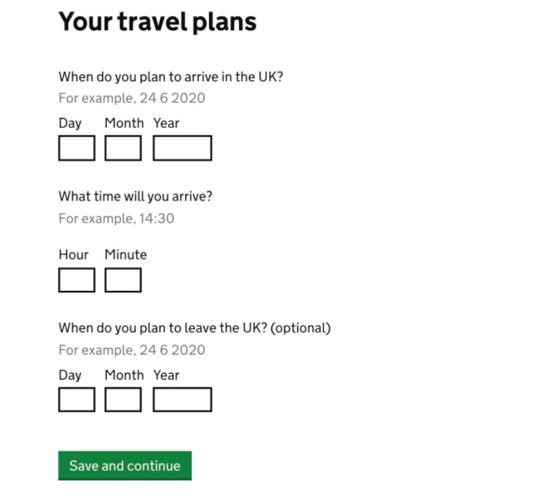 首先,需要填写你计划到英国的日期及具体的时间,以及计划离开英国的时间(这一项是选填)。