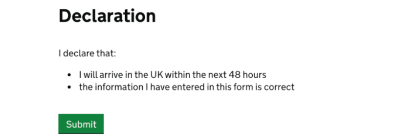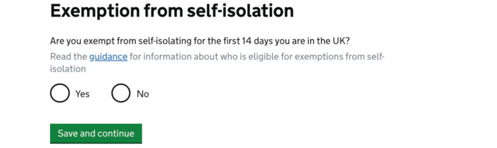 接下来会问到你是否免除自我隔离,从中国大陆到英国的同学们都是需要自我隔离的,所以这里需要选择No。