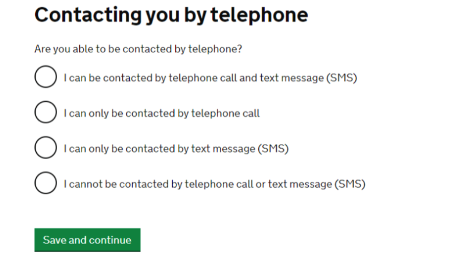 接下来的问题是让你选择英国官方联系你的方式。一共有四个方式:通过打电话或发短信进行联络;通过电话进行联络;通过短信联络;不能通过电话或短信联系。