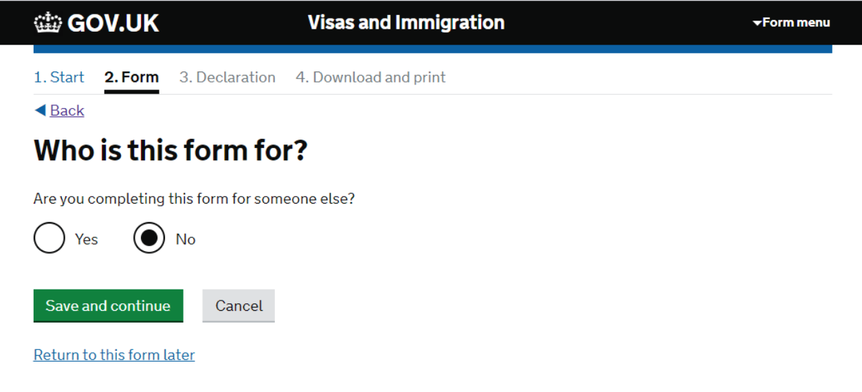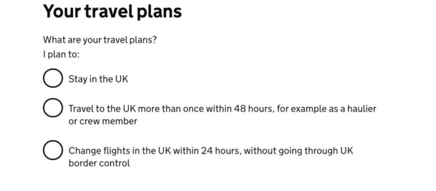 第一个问题是你是否计划短暂待在英国。对于英国留学生来说,这个问题要选第一个(stay in the UK)