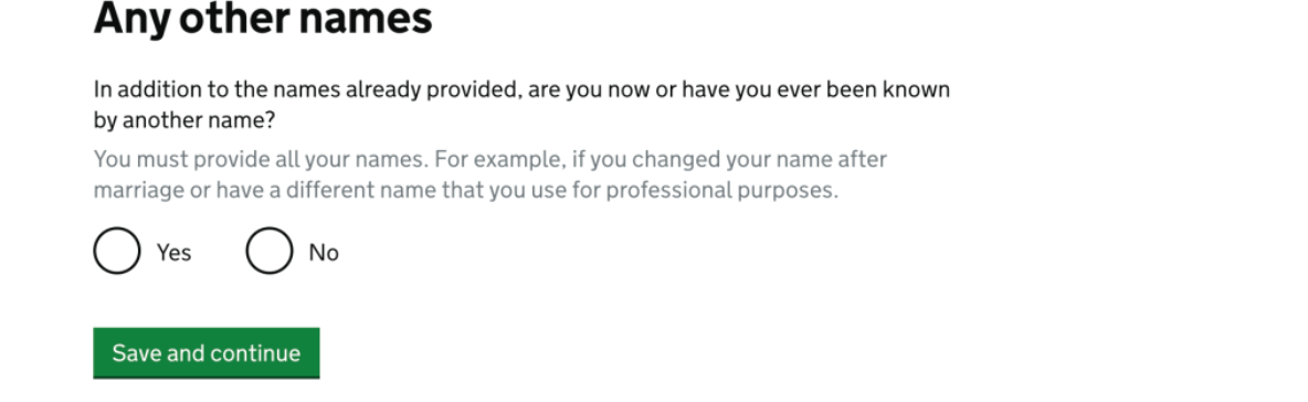 下面就到询问姓名及是否有其他名字。这一部分一定要完全按照护照上的信息填写。如果没有其他名字,选择No就可以。