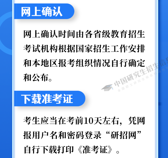 全国硕士研究生招生考试报名包括网上报名和网上确认两个阶段。网上报名工作安排在10月5日至10月25日(每天9:00—22:00),预报名工作安排在9月24日至9月27日(每天9:00—22:00)。所有参加全国硕士研究生招生考试的考生均须在规定时间内进行网上报名和网上确认。在部队荣立二等功等符合免初试攻读硕士研究生资格条件的人员,应在国家规定的全国统考报名时间内登录“中国研究生招生信息网——全国推荐免试攻读研究生信息公开暨管理服务系统”报名。
