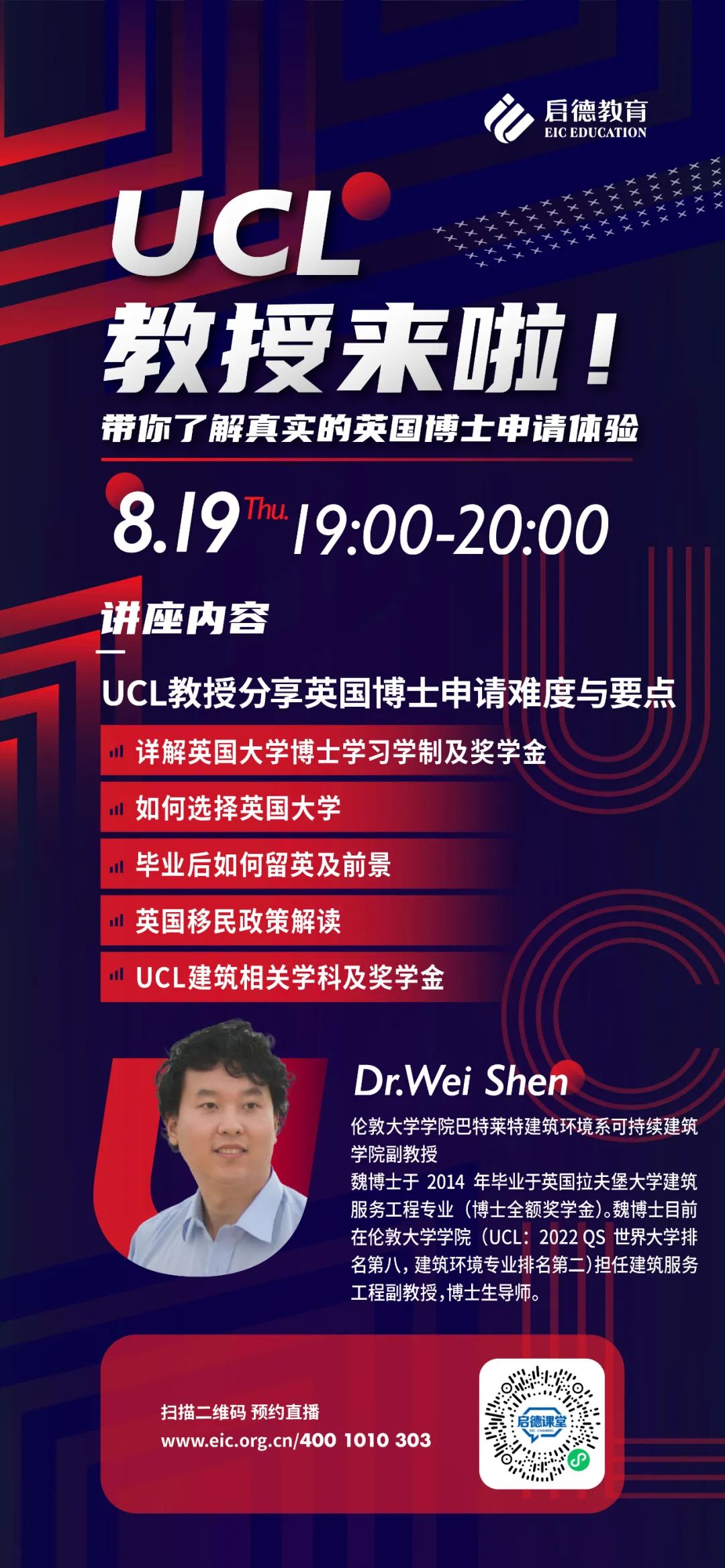 排名标准 首先,被考虑纳入最佳留学城市排名的城市要符合两个条件:城市人口超过25万;至少有两所大学上榜最新QS世界大学排名。 在此次排名中,有164个城市符合考虑范围。 QS最佳留学城市排名依据六大类指标,除特殊说明情况外,每项指标所占权重相同。 · 大学排名 该指标旨在反映一个城市的大学在QS世界大学排名的集体表现,以及一座城市中大学的吸引力。 · 学生构成 该指标旨在从整体和国际的角度来看一座城市的学生构成。学生比例较高的城市可能更好地配备了学生所需的设施,而国际学生人数较多的地区则更有可能做好迎接更多国际学生的准备。 · 合意性 该指标旨在反映留学目的地的总体合意性。虽然学生们可能在寻找充满机遇、令人兴奋的城市,但他们(和他们的父母)也可能担心当地的安全。为了反映这些不同的需求,需考虑一系列广泛的指标。 · 雇主活动 该指标基于QS的全球雇主调查,旨在说明哪些城市最受毕业生雇主的欢迎。 · 负担能力 该指标旨在反映在考虑学费和一般生活成本的情况下,一所城市的可负担能力。 · 学生观点 该指标基于一项从全世界收到超过95000份答复的学生调查。 排名亮点 本次排名伦敦排名世界第一,紧随其后的是慕尼黑(第二)以及首尔和东京(第三)。 北京被评为全球25个最适合留学的城市之一,在全球排名并列第25位,同比上升了7位,在亚洲排名第6位。 作为再次蝉联榜首的伦敦,自然是众多留学生向往的地方。英国G5院校中,有三所位于伦敦,其中最老牌的一所是伦敦大学学院UCL。 伦敦大学学院是英国规模最大、学科最广的综合性研究型大学,专精于医学、法学、经济学、计算机科学、历史学、统计学、生命科学、建筑学以及教育学等学科领域,有着非常严苛的录取标准,其开授的众多专业的录取率极低。 UCL诞生过35位诺贝尔奖得主,科研实力毋庸置疑。因此许多对学术有追求的学子会选择去UCL读博。那么怎么才能去UCL读博呢?奖学金该怎么申请呢?在UCL读博又有怎么样的感受呢? 8月19日19:00,UCL教授来啦! UCL巴特莱特建筑环境系可持续建筑学院副教授 带你了解真实的英国博士申请体验