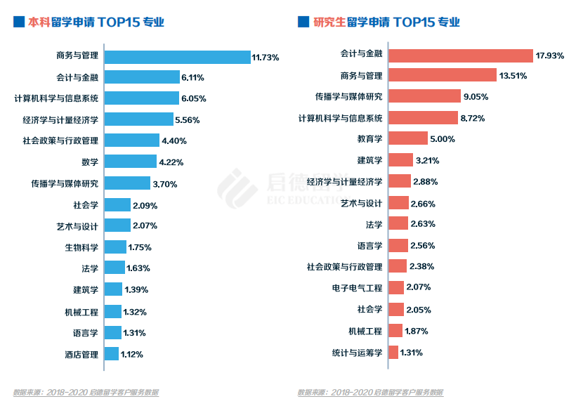 本科留学申请排名前三的专业分别为商务与管理(11.73%)、会计与金融(6.11%)、计算机科学与信息系统(6.05%)。另外,经济学与计量经济学、社会政策与行政管理、数学专业申请占比也排名靠前。
