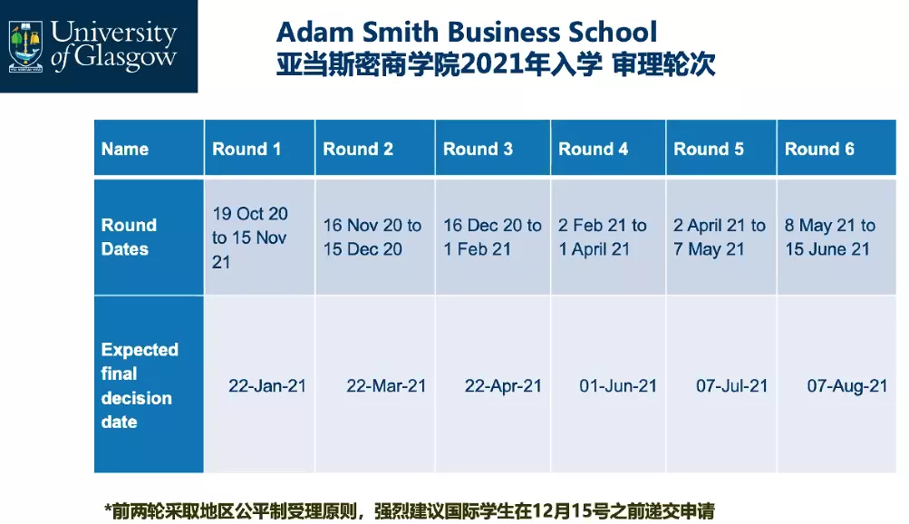 格拉斯哥大学亚当斯密商学院已于11月15日关闭第一轮申请。同时,格拉斯哥大学亚当斯密商学院还强烈建议国际学生在12月15日之前提交申请。