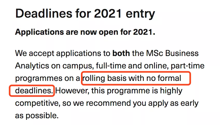 帝国理工学院的4个商科专业(包括Business Analytics Economics & Strategy for Business;Management;Strategic Marketing)将采用滚动录取方式,没有申请截止日期,但招满即关。