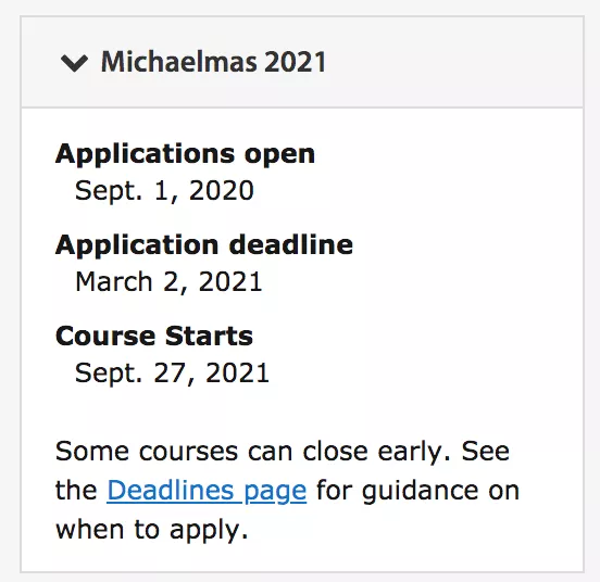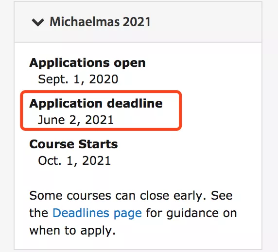 其中,MPhil in Management及Mphil in Finance两个专业截止时间最早,将于2月25日截止申请。