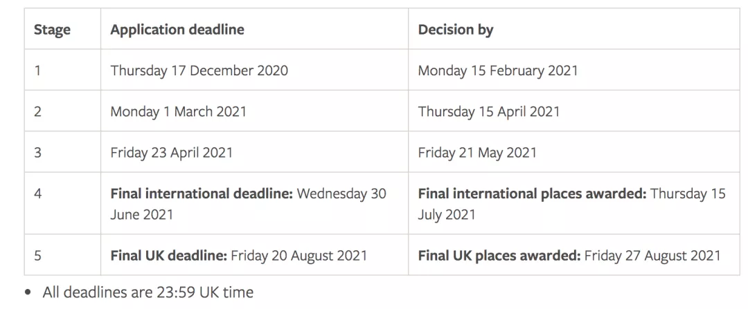 剑桥大学每个专业都有不同的申请截止时间。