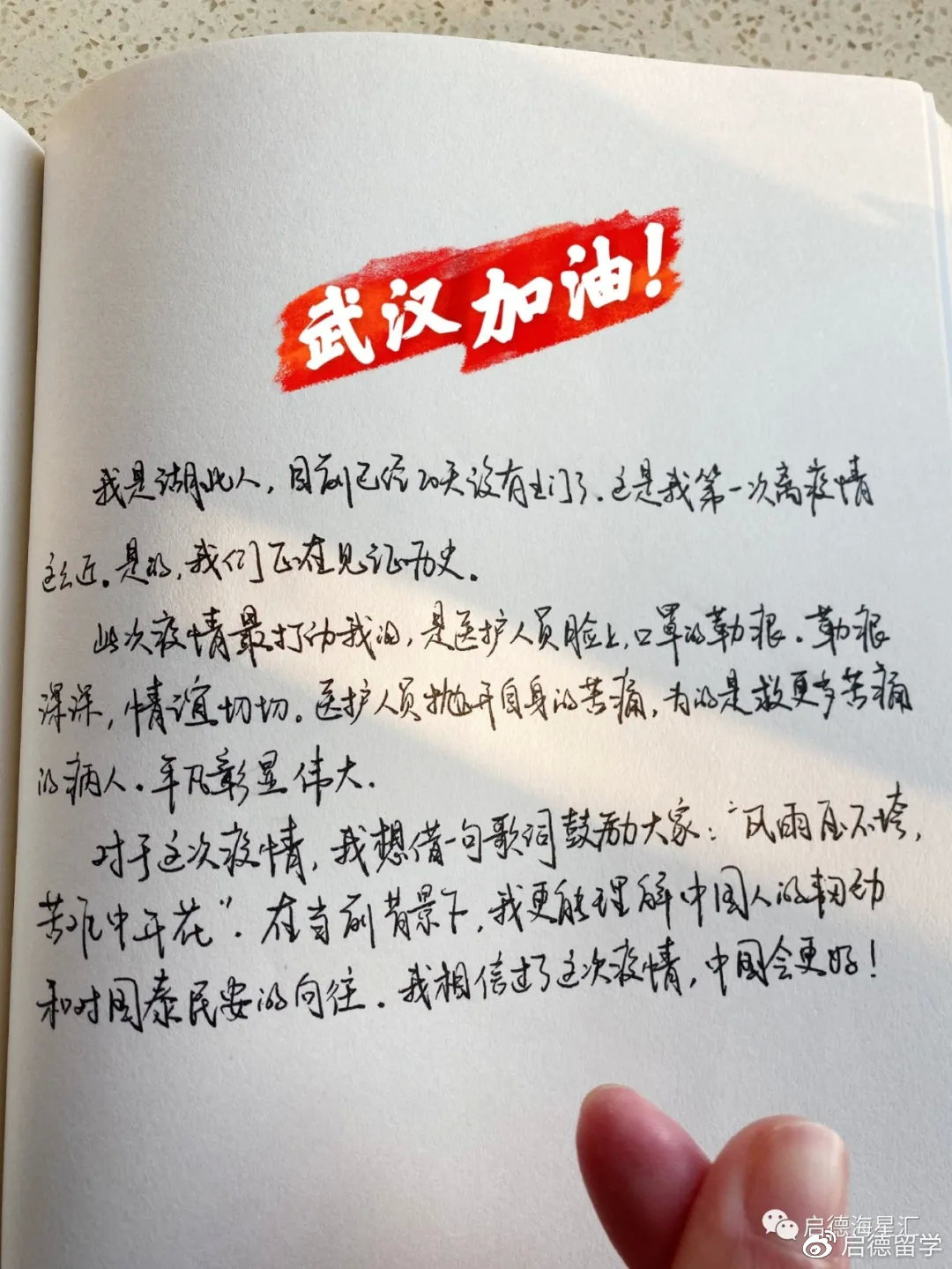 虽然这次新冠疫情仍在蔓延,一些国家的确诊数字也多了起来,虽然启德海星汇的学长学姐们身处世界不同的角落,但是他们仍希望用自己的方式驰援武汉,加油中国!