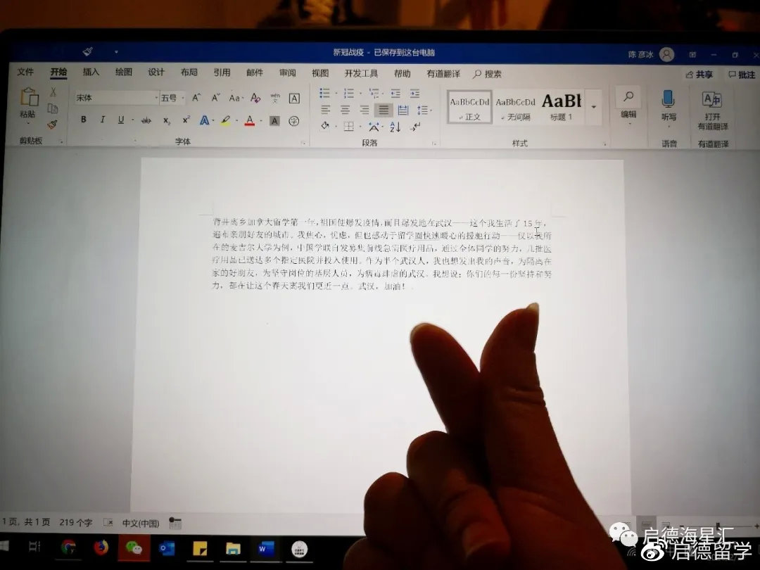 在这次疫情中,每一位中国人都看过了太多,好的坏的。希望人间能有更多的善,也能有更多的爱,庇护我们,不困于情绪,也不困于病毒。也希望每一位海外学子,每一位战“疫”下的我们,都能保护好自己,同时坚守自己的岗位,在这场举国对抗病毒的战役中,勇敢、健康、坚强、积极进取,我们齐心协力共度劫难,迎接春暖花开,迎接久别重逢。