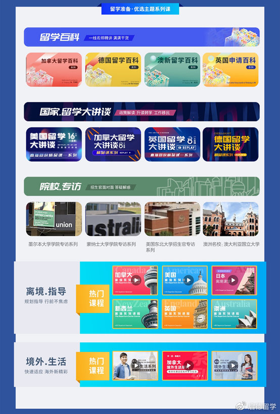 第三部分《留学准备优选主题系列课程》内容最为全面,不仅有美国、加拿大、澳大利亚、英国、德国的留学百科系列课程及留学大讲谈直播回放,还有多个中国学生主流留学目的国家的离境及境外生活辅导,这一部分的课程也一直是启德课堂点击量较高的热门系列;