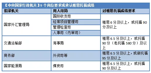 9个中央国家行政机关岗位要求或承认雅思托福成绩