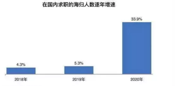 根据报告中的数据显示,2020年,在国内求职的海归人才数量较2019年猛增33.9%。产生留学生扎堆回国现象的原因也并不难猜。一个是国家鼓励留学生回国就业,不少一线大城市还为留学生准备了丰厚的落户政策。还有一个重要原因就是留学生因为有在海外的求学经历,而在就业过程中占据一定的背景优势和语言优势。