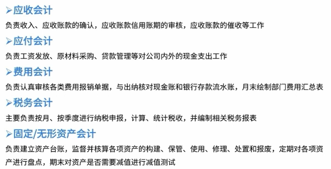 一般根据会计科目会分,包括应收会计、应付会计、成本会计、税务会计等。