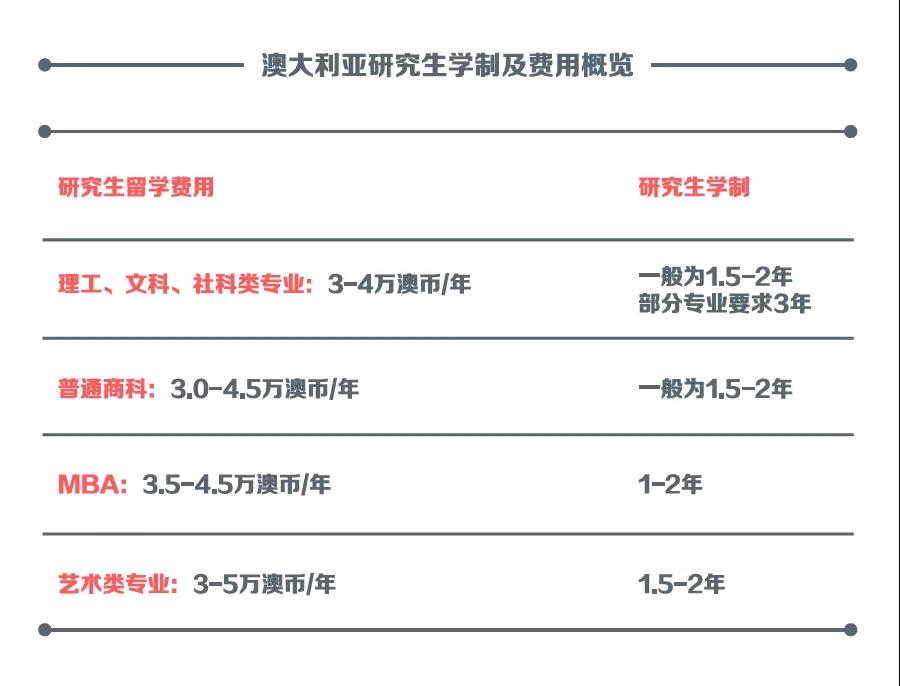 下图为澳大利亚研究生学制及费用:
