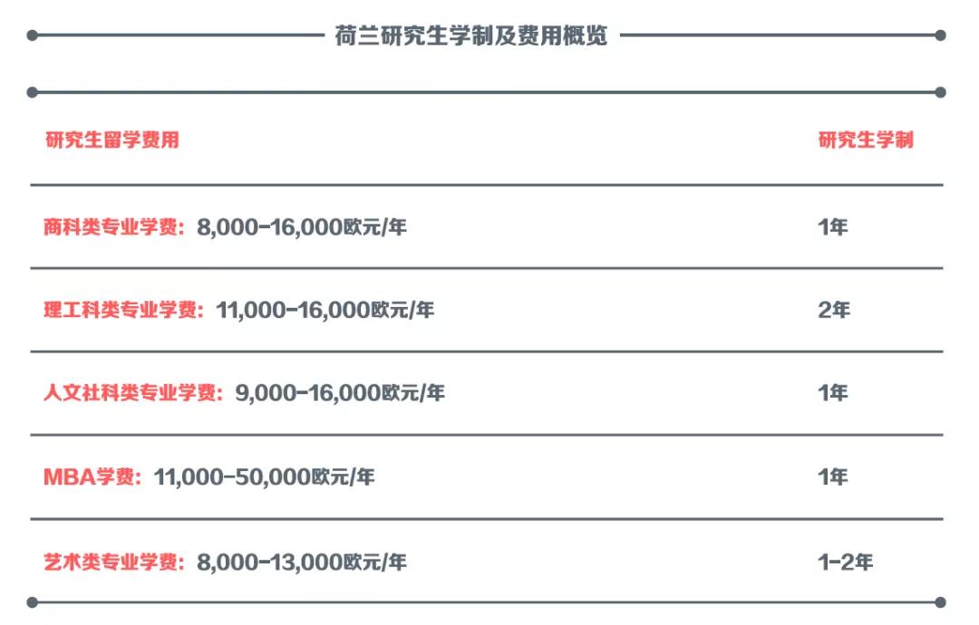 下图为荷兰研究生学制及费用: