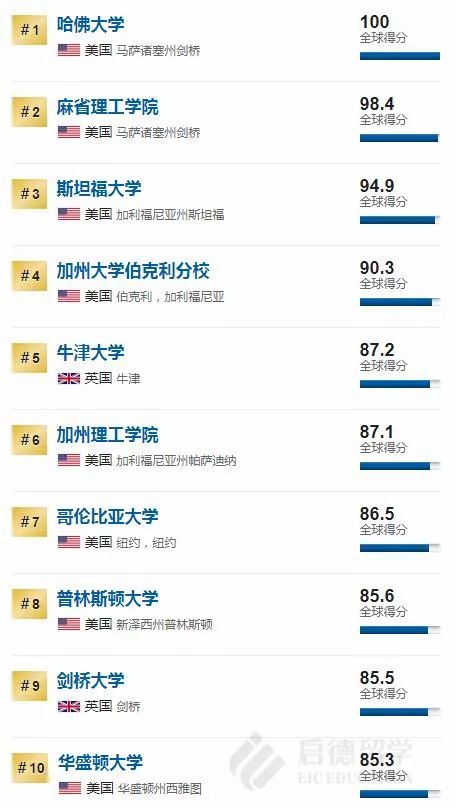 此次排名,居于榜首的当属哈佛大学,其次是MIT,斯坦福名列第三。前20基本被美国霸占,除了牛津(排名第5)、剑桥(排名第7)和伦敦帝国理工学院(第18名)这3个学校遗世独立。