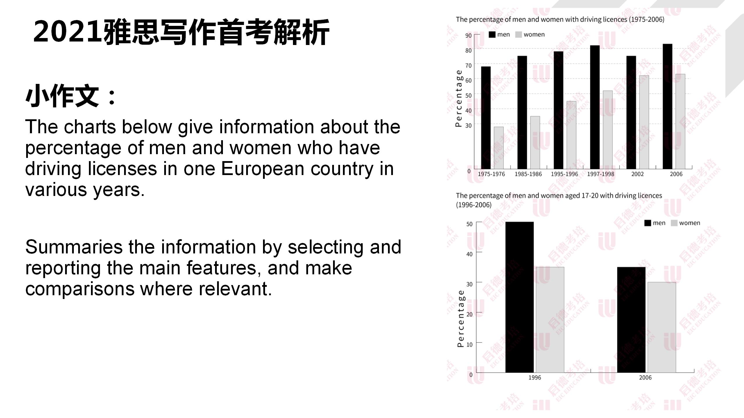 雅思写作2021年首考小作文考的图型为双柱图,题目大意为:一个欧洲国家在不同年份拥有驾驶执照的男性和女性的比例信息。遇到这样的图型,所有的雅思小作文的第一段都是需要进行开头的改写,第二、三、四段会进行分段思路的描述,先选择数据再叙述趋势。2021年首场写作小作文双柱图,可以就每幅图分别进行一段描述,在结尾部分的一段进行整体总结。