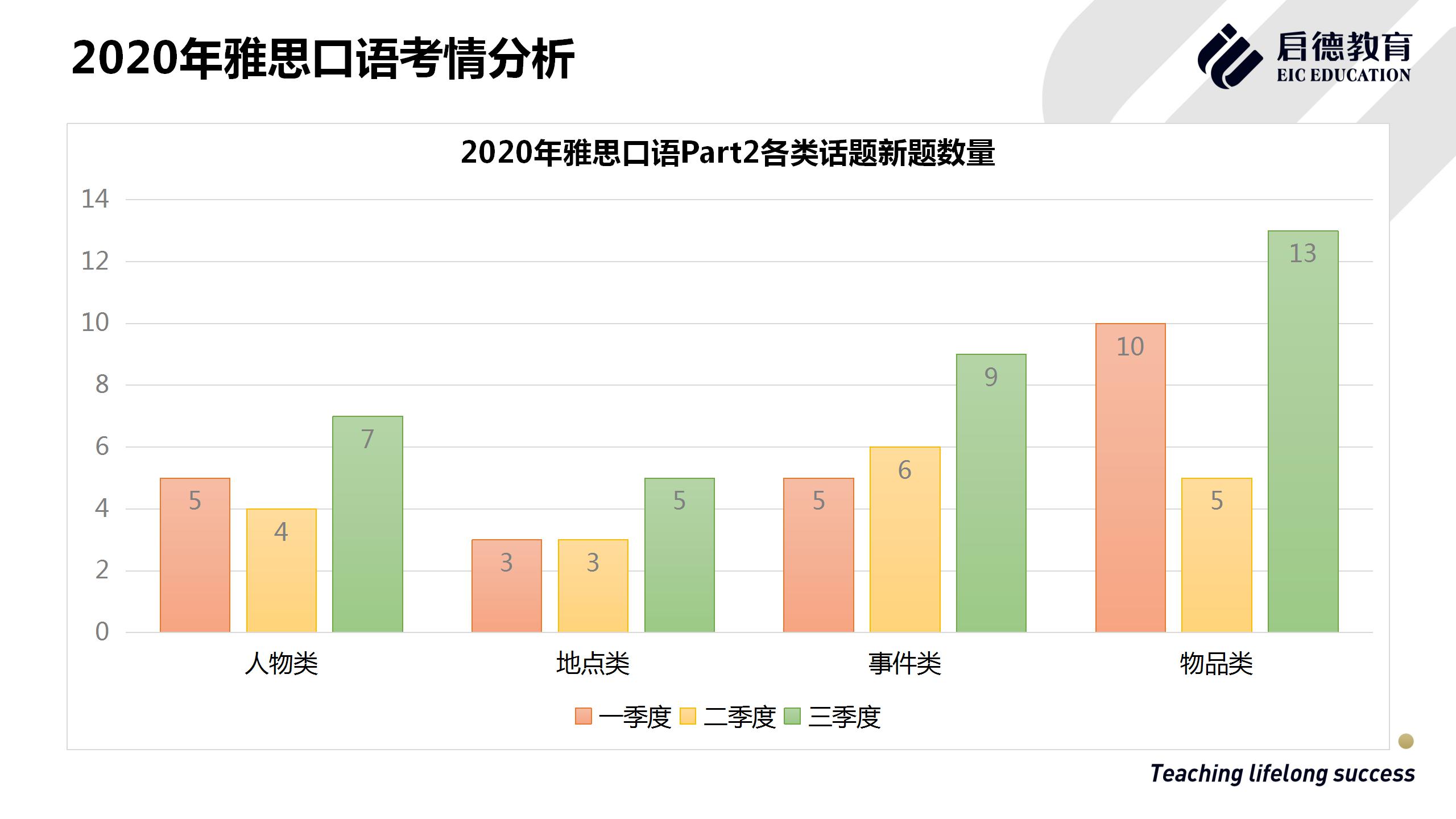 启德考培北京学校李乐老师针对2020年雅思口语考试进行了细致的分析:从雅思口语2020年考情趋势来看,新题的数量不断在增加,Part 1(第一部分)的各类话题比重比较多变,但是一直占主导的是“人物与事件”、“吃穿住行”、“个人信息”、”爱好”这四大类话题;Part 2(第二部分),物品和事件类话题为 2020 年新题的大热,且难度在逐步增加;Part 3(第三部分)难度一直在上升,考生如果雅思口语想拿到6分甚至更高,在Part 3(第三部分)一定要做足准备。