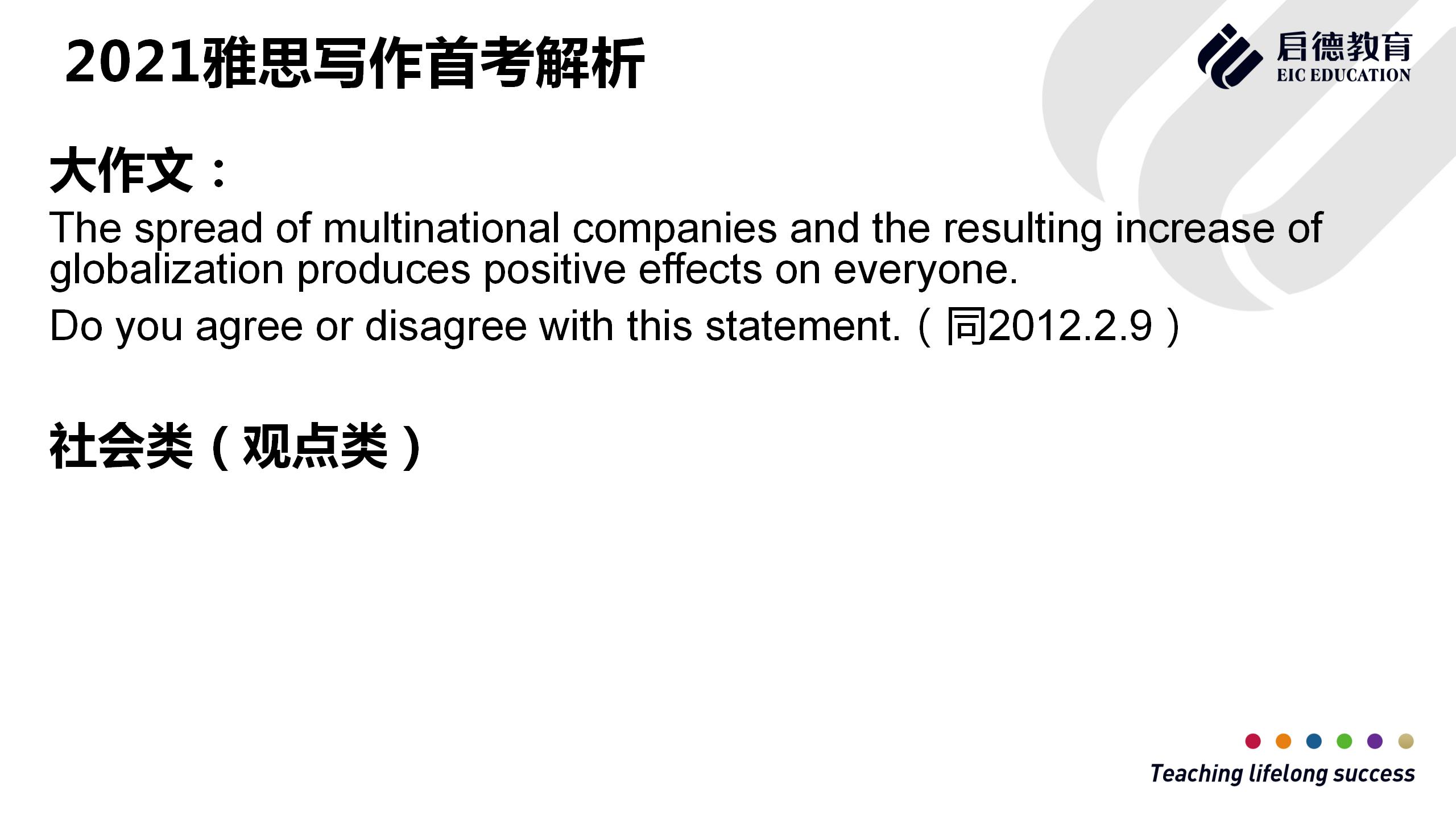 雅思写作2021年首考大作文,题目大意是跨国公司的传播和全球化的发展对每个人都产生了积极的影响,属于社会类话题,题型为观点类。首先要审题,要找够、并要找准题目中的关键词,然后确定论点展开讨论。