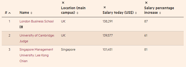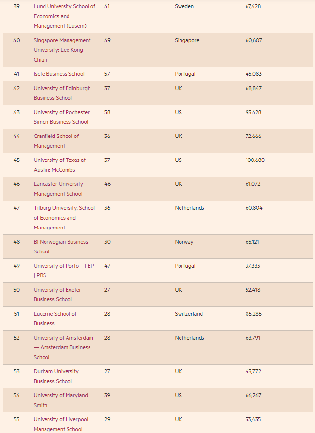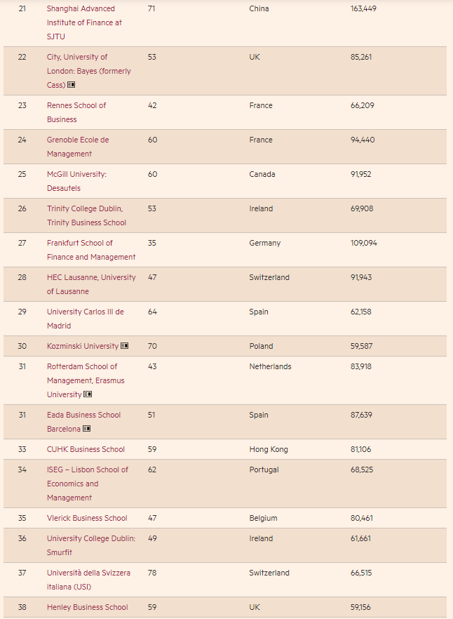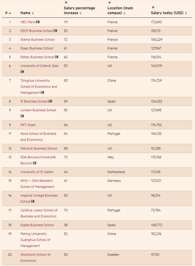 巴黎高商 HEC Paris 自2018年以来,连续位列该榜单第1名。巴黎高商的核心竞争力是校友薪资涨幅,该校学生在毕业三年后的工资增长幅度最大,平均工资排名第三,年薪接近 17.3 万美元。学校的职业服务和国际流动性方面得分也很高。ESCP欧洲高等商学院排名第2,SKEMA商学院位列全球Top 3,ESSEC 埃塞克高等商学院排名第4,EDHEC 北方高等商学院,位列第5。TOP10榜单中,英国的牛津大学位列第6,中国的清华大学经管学院排名第7,西班牙IE商学院排名第8,美国顶尖商学院——麻省理工学院的斯隆商学院,与英国的伦敦商学院并列第9。其中,麻省理工学院的斯隆商学院金融硕士校友的平均收入为 174,752 美元,是TOP10排名中最高的。英国12所,法国7所,美国4所,中国4所(中国大陆3所,中国香港1所),葡萄牙5所,西班牙4所,瑞士4所,荷兰3所,德国2所,瑞典2所,爱尔兰2所,新加坡1所,加拿大1所,比利时1所,意大利1所,波兰1所,挪威1所。伦敦商学院(LBS) 仍然位居榜首,LBS 校友的薪资涨幅最高,学校在国际课程体验方面排名第一,女性教师比例也很高。剑桥Judge商学院在性价比、职业服务和国际工作流动性方面得分最高。其校友薪资最高,接近 140,000 美元。新加坡管理大学李光前商学院是亚洲乃至世界TOP类财经类院校,以其卓越的科研成果和一流的教学闻名全球。从排名中可见金融专业的学生,“钱途”无量!如何找到最适合自己的金融硕士,申请到理想的院校?下方扫码添加小助手为你解答!
