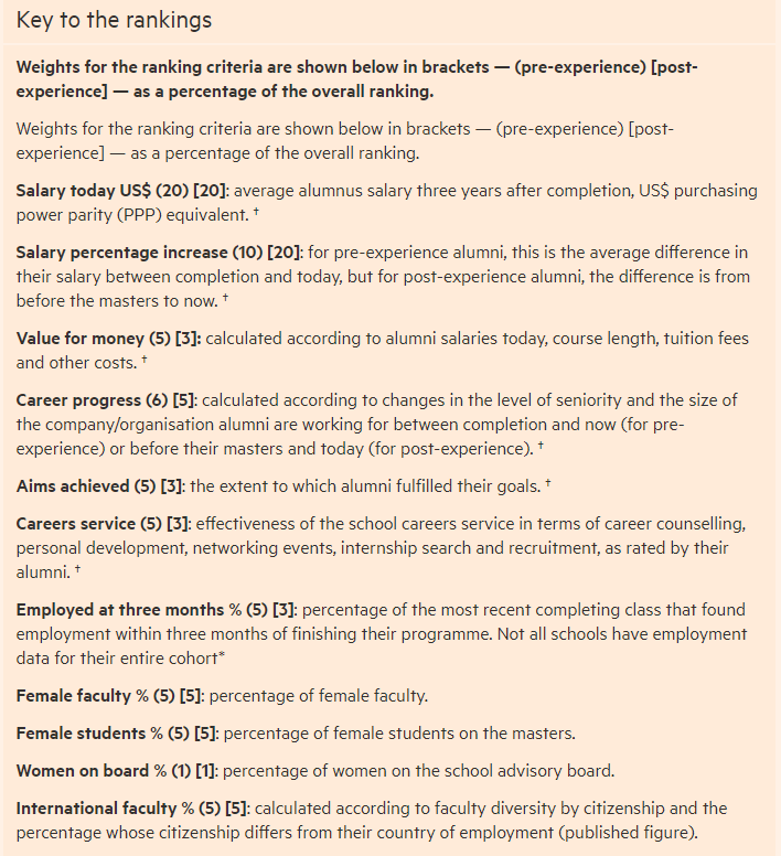 作为全球金融领域最具权威性的全球媒体之一,《金融时报》每年所发布的金融硕士排行榜都备受全球学术界及企业界关注,而这一排名也是各大金融企业招聘的重要源依据之一。作为一份注重教学效果、学生体验的评分的排行榜。一共有19项指标,其中16项计入总分。排名指标包括:毕业后三年的平均校友工资,薪资涨幅,课程性价比,晋升幅度,职业发展水平,学校职业服务,毕业三个月内找到工作的比例等16项指标。上榜的大学商学院必须拥有全日制、每年不少于30名毕业生、且被AACSB或Equis认证的金融硕士项目。一所学校要想获得排名,还要有至少20%的校友对《金融时报》的调查做出回应,至少完成20次调查。本次排名共调查了6264名来自无需工作经验(Pre)的毕业生和339名来自需要工作经验(Post)的校友。无需工作经验版(Pre)排名,校友的回答提供了七个类别,这些类别共占总权重的59%,其他类别根据学校数据计算的,占比41%;需要工作经验(Post)排名中,校友的回答提供了七个排名标准,占总权重的62%,其余类别取自学校数据,占38%。在这两个排名中,校友目前的平均工资权重最高,均占比20%;薪资增加权重在无需工作经验版(Pre)排名中占比10%,在需要工作经验版(Post)排名中占20%。今年共有81所学校参加本次排名,其中79所参与了无需工作经验(Pre)金融硕士排名,5所参与了需要工作经验(Post)金融硕士排名。阿姆斯特丹商学院、伦敦商学院和新加坡管理大学李光前商学院这三所学校都参加了以上两类排名。欧洲学校在排名中处于主导位置。欧洲商学院的学费低,校友平均工资高。法国商学院开设金融硕士学位的历史悠久,与金融行业联系紧密。在Pre-金融硕士排名中,排名前五的商学院全部位于法国,实力稳定,排名次序与去年相比无变化。