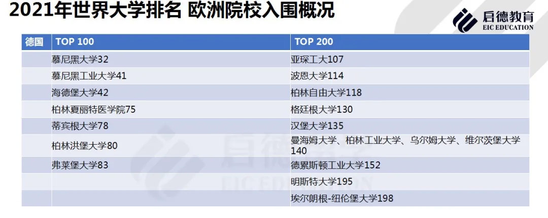 首先来看一下德国,德国是有21所院校入围到泰晤士排名前200的院校名单中,名次的变化有13所名次是较2020年有上升,有7所是较2020年有下降的,基本上这些学校,精英大学包含了11所,tu9大学包含了4所,所以说德国是有很多世界排名靠前的理工类大学和综合类大学,可以供小伙伴来进行选择的。