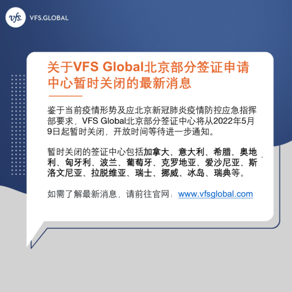 鉴于当前疫情形势及响应北京新冠肺炎疫情防控应急指挥部要求,VFS Global北京部分签证中心将从2022年5月9日起暂时关闭,开放时间等待进一步通知。 暂时关闭的签证中心包括加拿大、意大利、希腊、奥地利、匈牙利、波兰、葡萄牙、克罗地亚、爱沙尼亚、斯洛文尼亚、拉脱维亚、瑞士、挪威、冰岛、瑞典等。